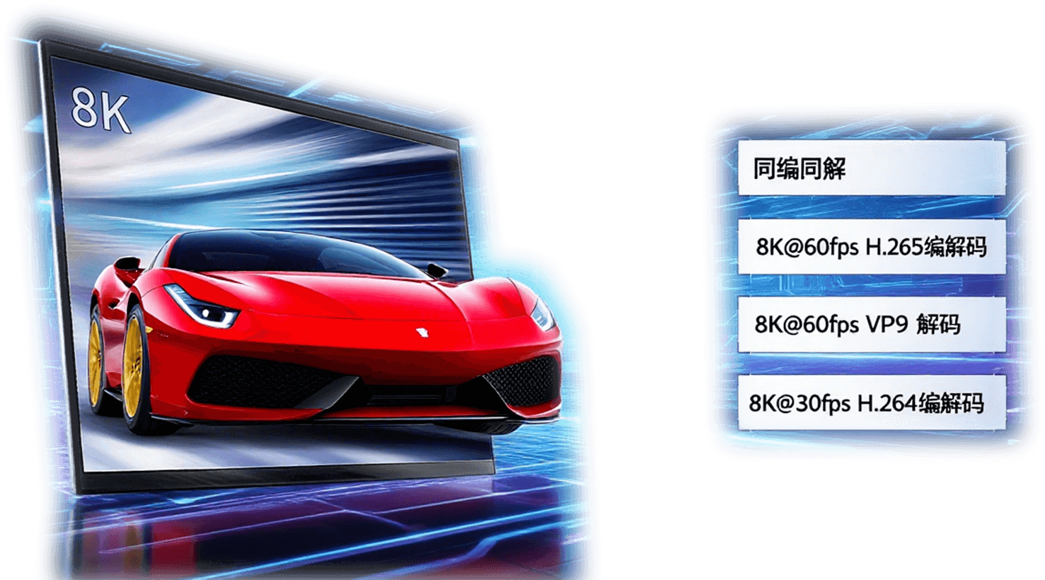 RK3588支持8K顯示輸出,并采用瑞芯微第四代編解碼技術,支持解碼器8K@60fps VP9、4K@60fpsAV1、8K@60fps H.265、8K@30fps的H.264;支持編碼器8K@30fps H.264和H.265;支持同編同解,最高可實現32路1080P@30fps解碼和16路1080P@30fps編碼;強大的視頻編解碼能力可讓畫面8K高清呈現,畫質更細膩。