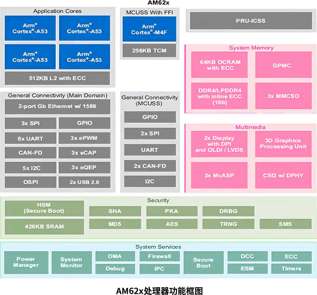 AM62x是一顆多核異構(gòu)處理器,采用Cortex-A53+Cortex-M4F的處理核+控制核架構(gòu)組合; 可通過M4F內(nèi)核及其專用外設(shè)實(shí)現(xiàn)功能安全特性,并且M4F內(nèi)核的啟動和運(yùn)行不再依賴A53內(nèi)核。