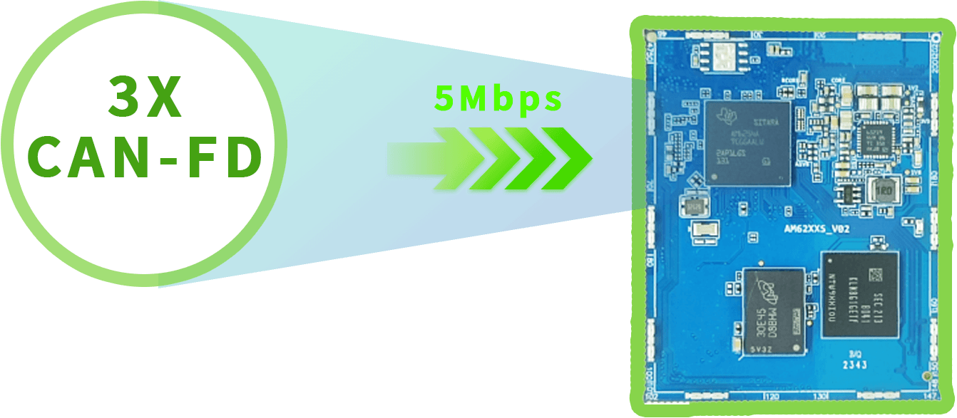 處理器原生支持3路CAN-FD,傳輸速度至高可達(dá)5Mbps,可高速、穩(wěn)定地接入到工業(yè)網(wǎng)絡(luò)系統(tǒng)中,為工業(yè)自動化和車載應(yīng)用提供功能支撐。