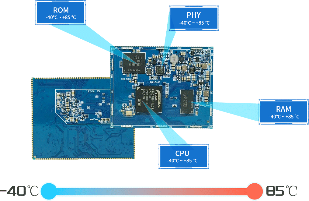 核心板全部器件采用工業(yè)寬溫-40~85℃設計,內(nèi)置看門狗、ESD靜電防護,嚴格按照工業(yè)標準測試和生產(chǎn),保障在戶外嚴苛環(huán)境下7×24小時不間斷穩(wěn)定運行,滿足工業(yè)應用的高質量和可靠性要求。