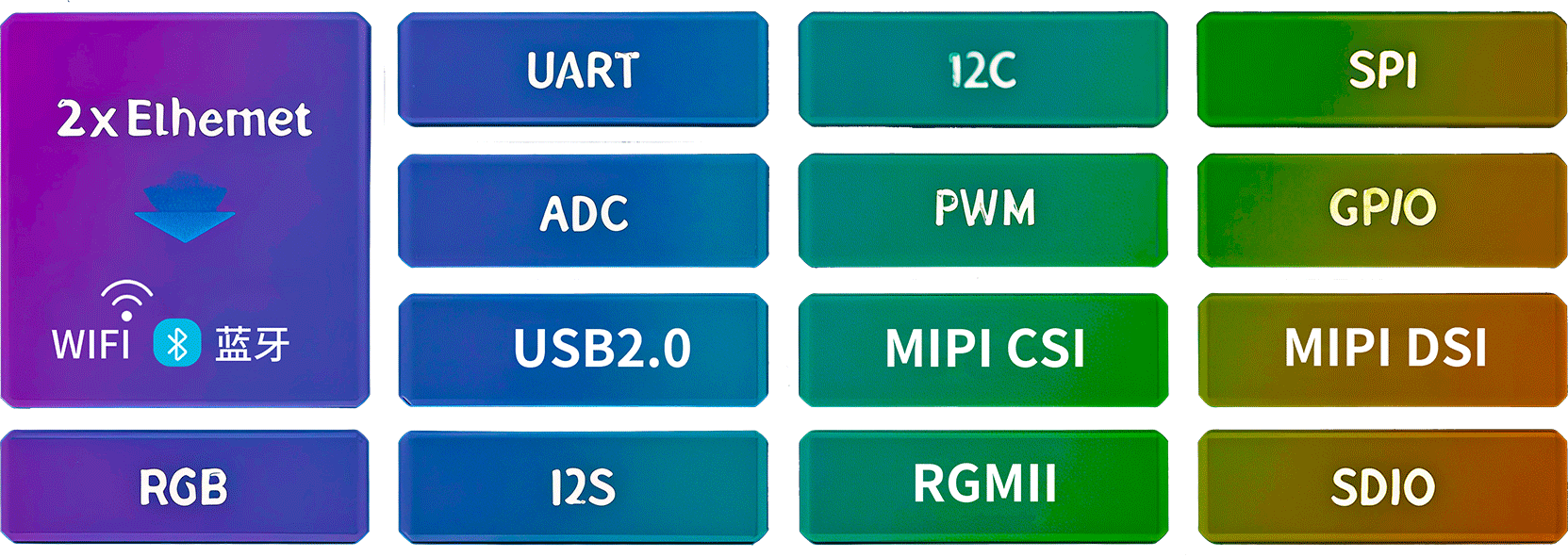 豐富的外設接口資源,讓WTC-G2LS核心板具有強大的易用性和泛用性;其具備2路千兆以太網(wǎng)控制器、2路CAN-FD、2路USB 2.0、7路UART、 MIPI-DSI、Parallel RGB、MIPI-CSI、DVP、SD、IIS、IIC、SPI、QSPI、PWM、ADC等常用功能接口。